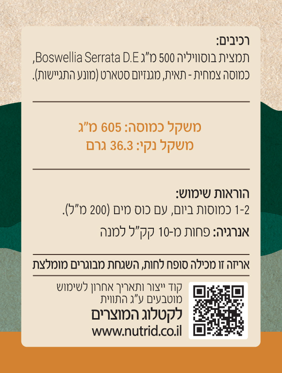 תמצית בוסוויליה 500 מ"ג Boswellia Serrata D.E, כמוסה צמחית - תאית, מגנזיום סטארט (מונע התגיישות).
