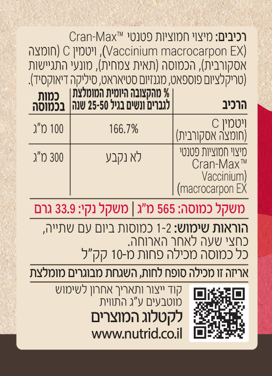 חמוציות ™Cran-max של נוטרי די מועשרות בוויטמין C להעצמת הספיגה, ואינן מכילות רכיבים שעברו הנדסה גנטית.