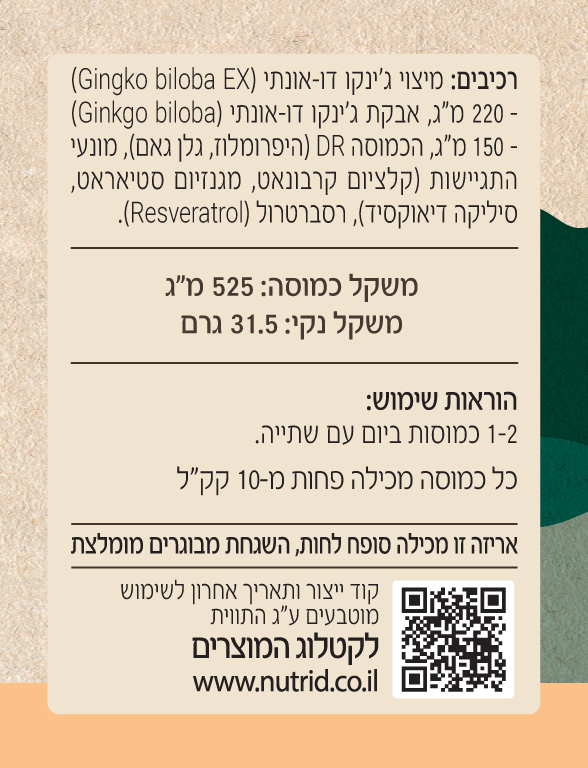 כמוסות ג'ינקו בילובה של נוטרי די מכילות פורמולה מתקדמת של מיצוי טבעי ואבקה טהורה של ג'ינקו בילובה בטכנולוגיית המיצוי הדואלי לספיגה אופטימלית, בתוספת נוגד החמצון העוצמתי רסברטרול.