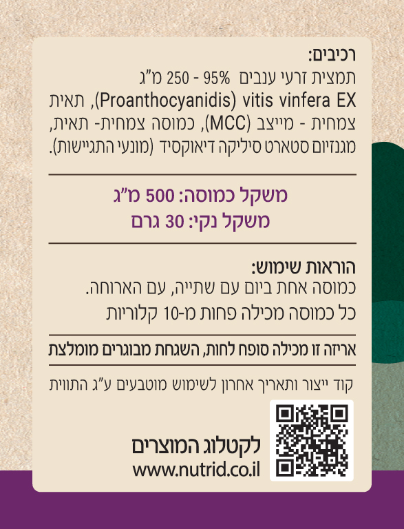 - זרעי ענביםמיצוי זרעי ענבי יין אדומים הינו עתיר נוגדי חמצון מסוג פלבנואידים. אלו עוזרים בחיזוק מערכת החיסון והאטת תהליכי הזדקנות, וכן מסייעים בנטרול תנועת רדיקלים חופשיים המזיקים לגוף.