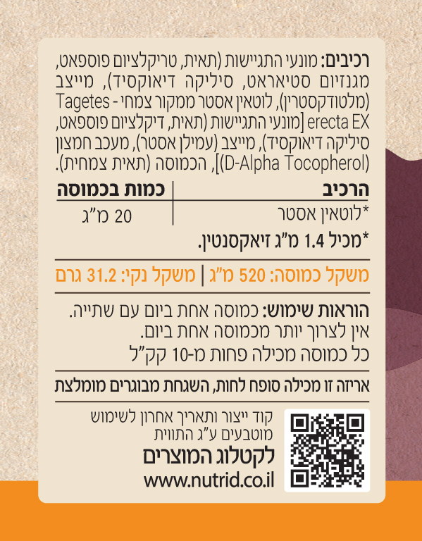 כמוסות לוטאין של נוטרי די מכילות 20 מ"ג לוטאין אסטר ממקור צמחי בכל כמוסה, בתוספת זיאקסנטין צמחי ונוגדי חמצון.