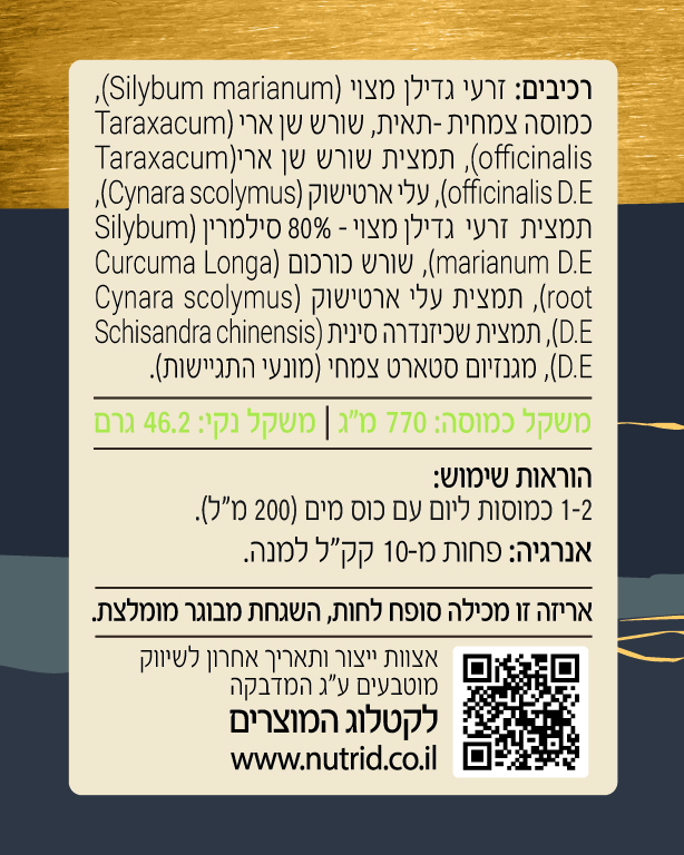 מסיבה זו פיתחנו את נוטרי דיטוקס, פורמולה מקצועית המכילה 6 צמחי מרפא ייחודיים שהוכחו מחקרית לניקוי רעלים וחיזוק פעילות הכבד.