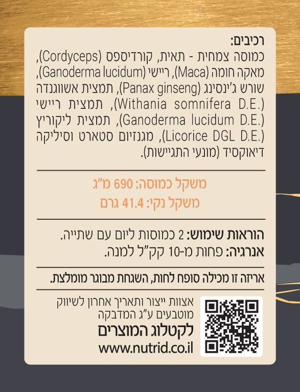 • מועשר במיצוי פטריות ריישי וקורדיספס במינון אופטימלי