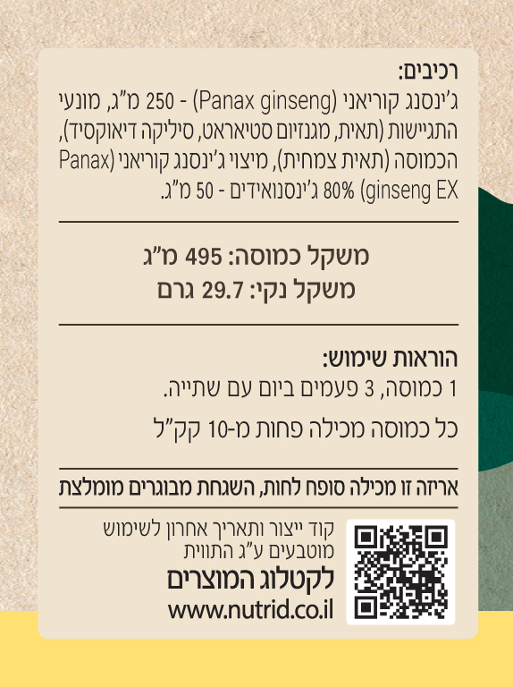 • במינון מחוזק – כל כמוסה שוות ערך ל-1,500 מ"ג אבקת ג'ינסנג קוריאני