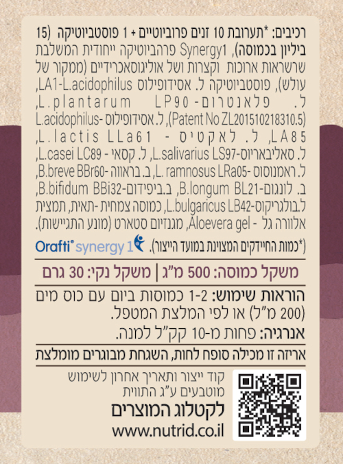 • מכילה 15 ביליון חיידקים מ-10 זנים פרו-ביוטיים