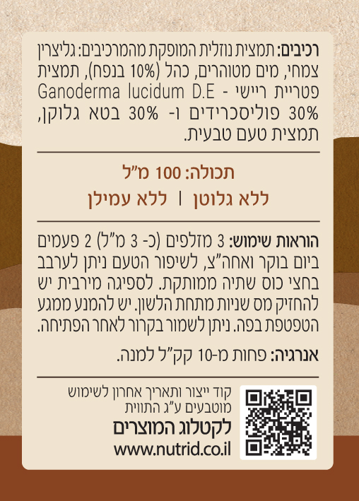 תמצית הריישי של נוטרי די מכילה מיצוי נוזלי של פטריית ריישי, ומיוצרת במיצוי כפול בטכנולוגיית DBE.