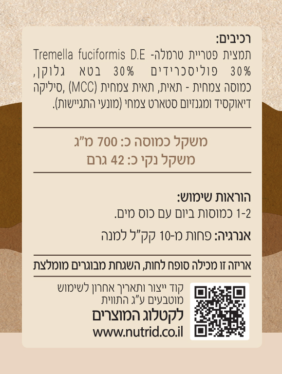 כמוסות פטריית טרמלה של נוטרי די מכילות מיצוי 100% גופי פרי. הפטרייה גדלה בתהליך גידול אורגני ייחודי ללא כימיקלים וללא חומרי הדברה מזיקים.