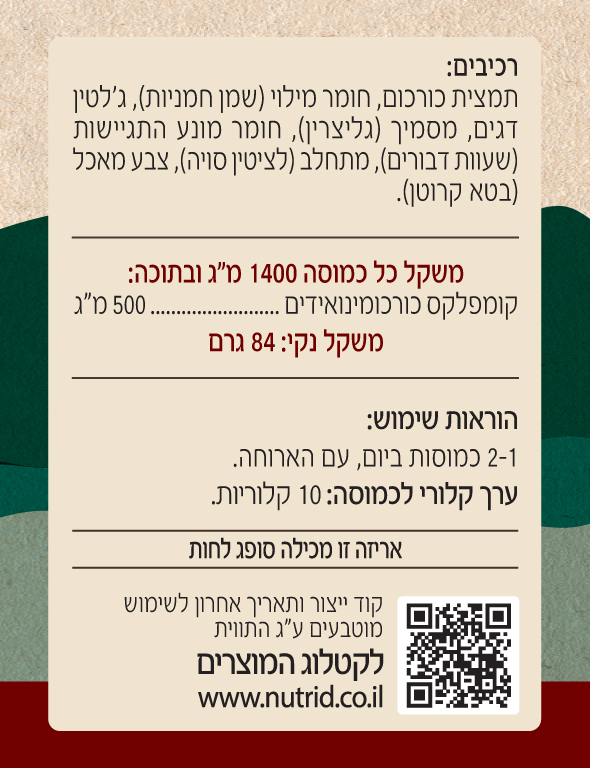 כמוסות כורכומין סופט ג'ל של נוטרי די מכילות פורמולה פטנטית BCM-95 המשלבת כורכומינואידים עם שמנים טבעיים משורש הכורכום.