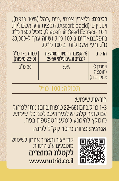 • מועשרת בוויטמין C בכמות גדולה – 30 מ"ג לכל 1 מ"ל