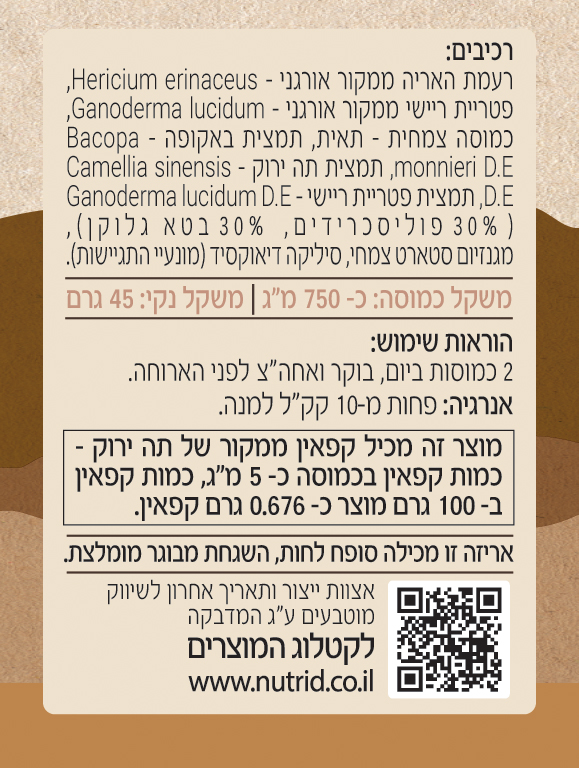 מסיבה זו פיתחנו במעבדות נוטרי די את נוטרי מיינד - פורמולה פטנטית ייחודית, המכילה פטריות ממקור אורגני ומיצויי צמחים שנחקרו בהקשר של שיפור הזיכרון ותפקוד המוח, מיקוד ושיפור הריכוז, ושמירה על חדות ובהירות המחשבה.