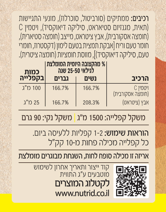 • התוסף של נוטרי די מכיל 100 מ"ג של ויטמין C בכל קפלייה. עם זאת, מאוד מומלץ לצרוך ויטמין C יחד עם התוסף, כדי לחזק את פעילותו.